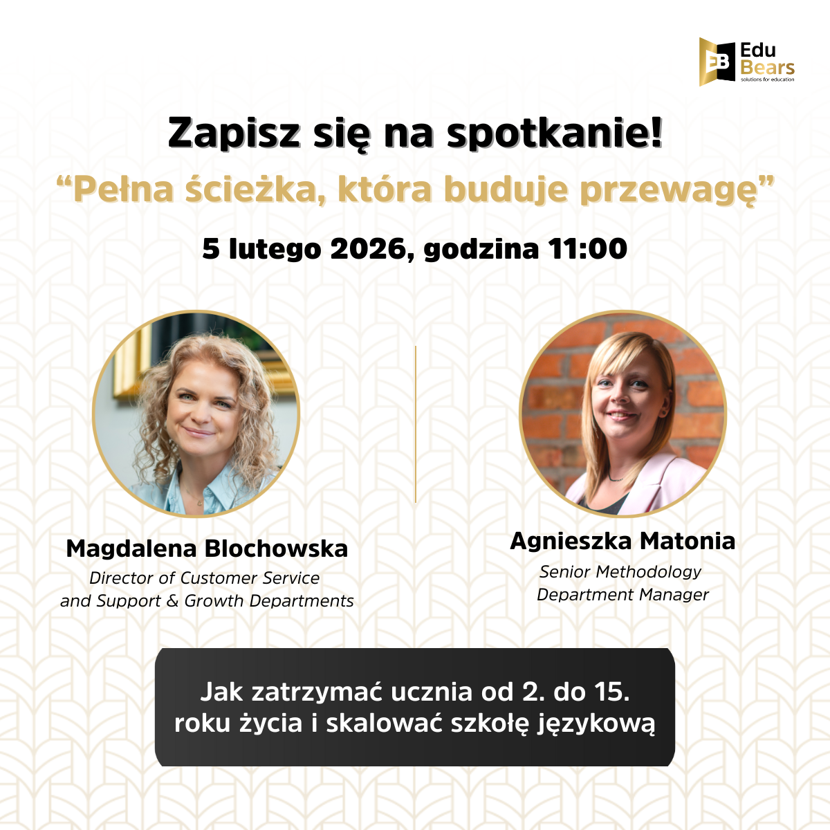 Umów się na spotkanie ze swoją Opiekunką Klienta i sprawdź, jakie korzyści przyniesie Ci rozszerzenie swojej oferty o kolejne metody Edu Bears! Zagwarantuj sukces swojej szkole!